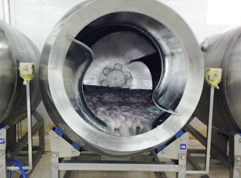 Trong các nhà máy chế biến chả mực, chả cá, cá viên, máy trộn giúp đảo đều thịt cá xay với các thành phần phụ, bảo đảm độ dẻo và không bị bở. Nhờ vậy, sản phẩm khi chiên hoặc hấp sẽ giữ được độ đàn hồi tốt.